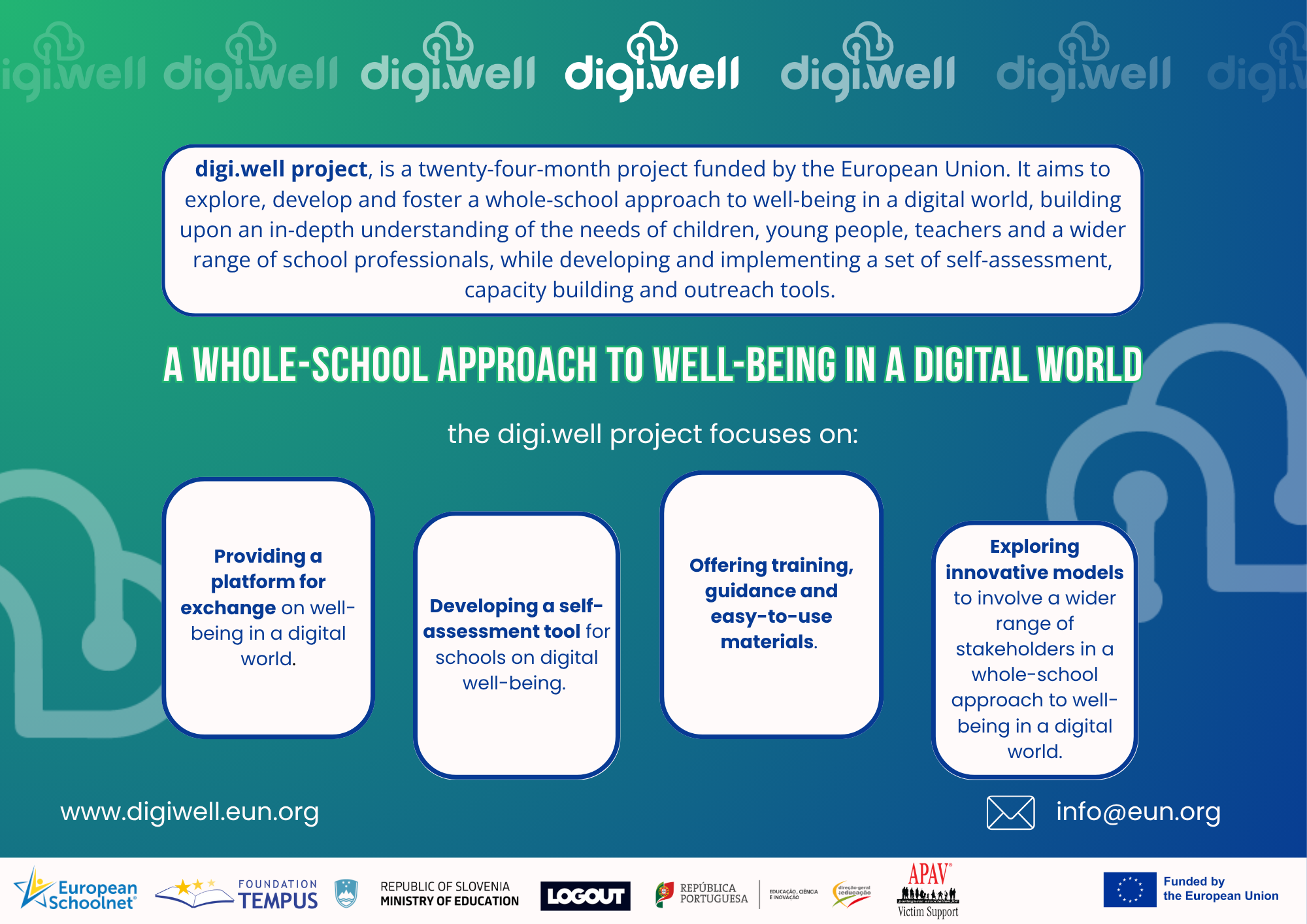 The digi.well project is a twenty-four-month project funded by the European Union. It aims to explore, develop and foster a whole-school approach to well-being in a digital world, building upon an in-depth understanding of the needs of children, young people, teachers and a wider range of school professionals, while developing and implementing a set of self-assessment, capacity building and outreach tools.